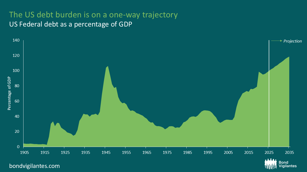 Running fiscal deficits when yields are high and debt-to-GDP levels are elevated can be risky business. The US is currently doing just that which explains why the bond market has revalued the compensation it demands for owning long-dated US Treasuries. The Congressional Budget Office (CBO) sees federal debt rise from 100% to 118% of GDP by 2035, reporting the highest point in US history.