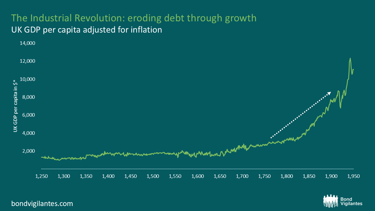 The Industrial Revolution transformed output and tax revenues, while the state held spending flat. The result was a slow but powerful denominator effect: GDP grew faster than the debt stock, even as prices remained stable or fell.