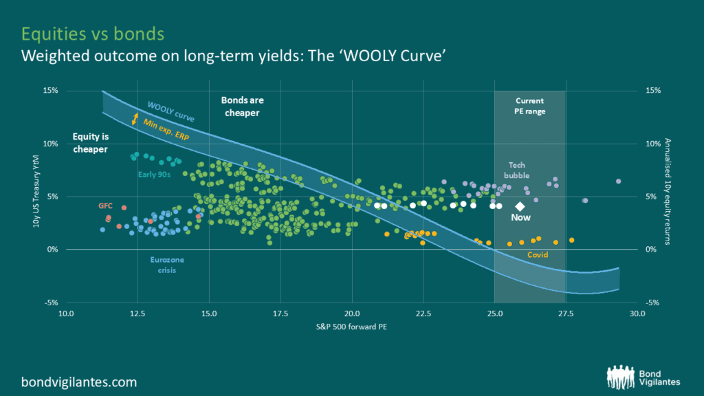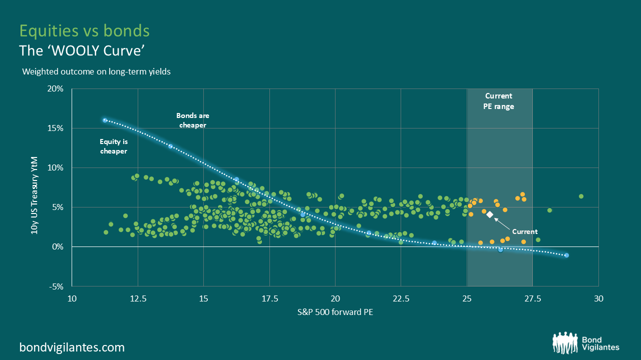 When the 10-year bond yield is higher than a modelled prospective 10-year historical equity return, per annum, then in this simple model bonds are cheap versus equities. We are essentially comparing the Weighted Outlook Of Longterm Yields on the graph. Or, the ‘WOOLY’ curve.