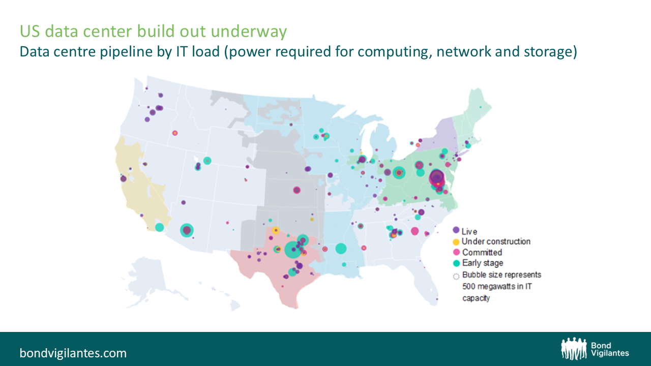 Source: DC Byte, Bloomberg NEF. Reported as of 15/04/2025. IT capacity is the amount of power a data centre needs for computing, network and storage