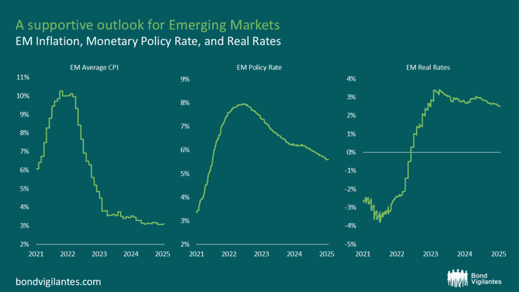 Simple average of 19 EM countries. Source: M&G, IMF. Countries included in the chart are : Local, Brazil, Chile, Colombia, Dominican Republic, Mexico, Peru, Uruguay, South Africa, Czech Republic, Hungary, Poland, Romania, Serbia, China, Indonesia, India, Malaysia, Thailand, Türkiye.