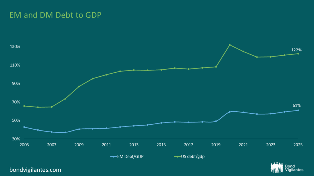 Against this backdrop, EM stands out: The chart below, compares EM and US fiscal dynamics. A simple average debt-to-GDP ratio for 19 countries in the J.P. Morgan’s GBI-EM index is roughly half that of the U.S., and over the past 20 years, EM debt has risen by 18 percentage points compared to a 57-point increase in U.S. debt (US debt nearly doubled over the same period).