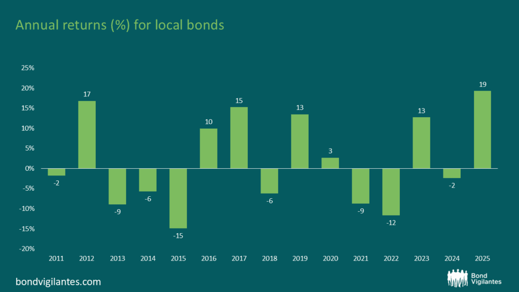 Source: Yearly return for local bonds, as proxied by J.P. Morgan GBI-EM Global Diversified index. Source: M&G based on J.P. Morgan calculations