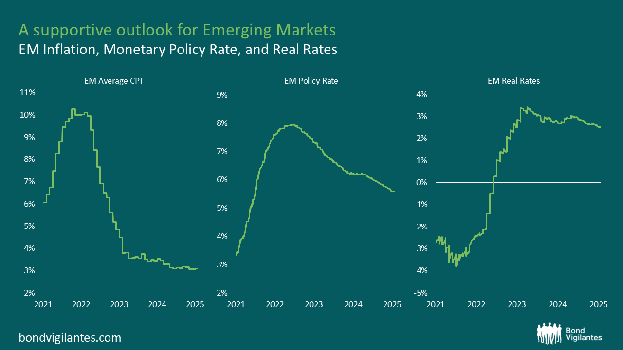 Emerging Market (EM) central banks have done an exceptional job in managing monetary policy over the last year, as despite widespread easing during 2025, EM real rates have remained broadly stable and at attractive levels. This means they avoided the common policy mistake of excessive easing. The three charts below illustrate this dynamic, showing the simple averages of EM policy rates, EM CPI, and EM real rates (policy rate deflated by 12-month CPI) for 18 EM countries. As the charts below show, real rates currently stand at approximately 2.5%, and have not moved much. Looking ahead, we would expect inflation to remain well contained through 2026, supported by stronger EM FX, subdued oil prices, and moderate GDP deceleration, all of which favour a supportive outlook for EM local bonds.