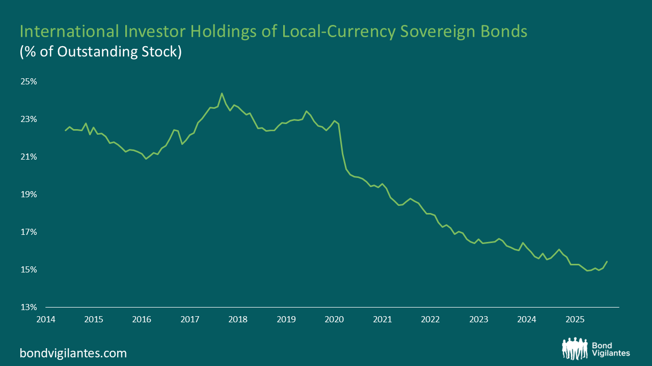 Positions are still light despite the rally: International investor ownership of local-currency sovereign bonds remains low by historical standards. Across 19 key EM countries, foreign participation averaged 15.4% of outstanding stock as of September 2025. Well below pre-COVID levels, when foreign holdings exceeded 20%. While part of this decline reflects supply dilution rather than outright selling, it suggests that much of the 2025 rally occurred with limited foreign involvement.