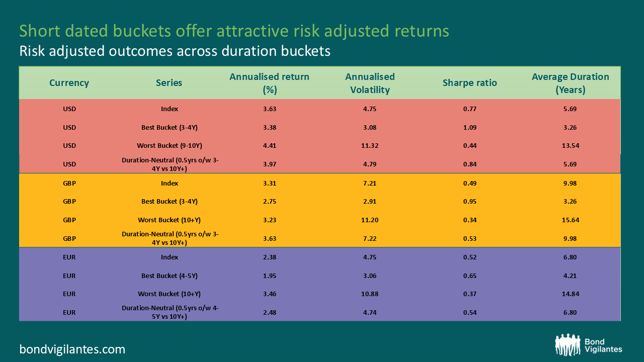 The best performing bucket in Gilts and Treasuries was the 3-4yr, while in Bunds the 4-5yr bucket performed best. Whilst these short end buckets may have benefited from the greatest rolldown, in a secular falling yield environment, they (unsurprisingly) delivered lower total returns than the broader index and their longer-dated peers, due to being shorter duration. So far so unsurprising, but when we looked at the risk adjusted returns, things start to look more interesting. As you can see in the table summarising the results, once the volatility of returns is considered, the short-dated buckets show their value to an investor. The historic Sharpe Ratios (the return per unit of volatility) of the lower duration buckets is meaningfully higher than the competition.