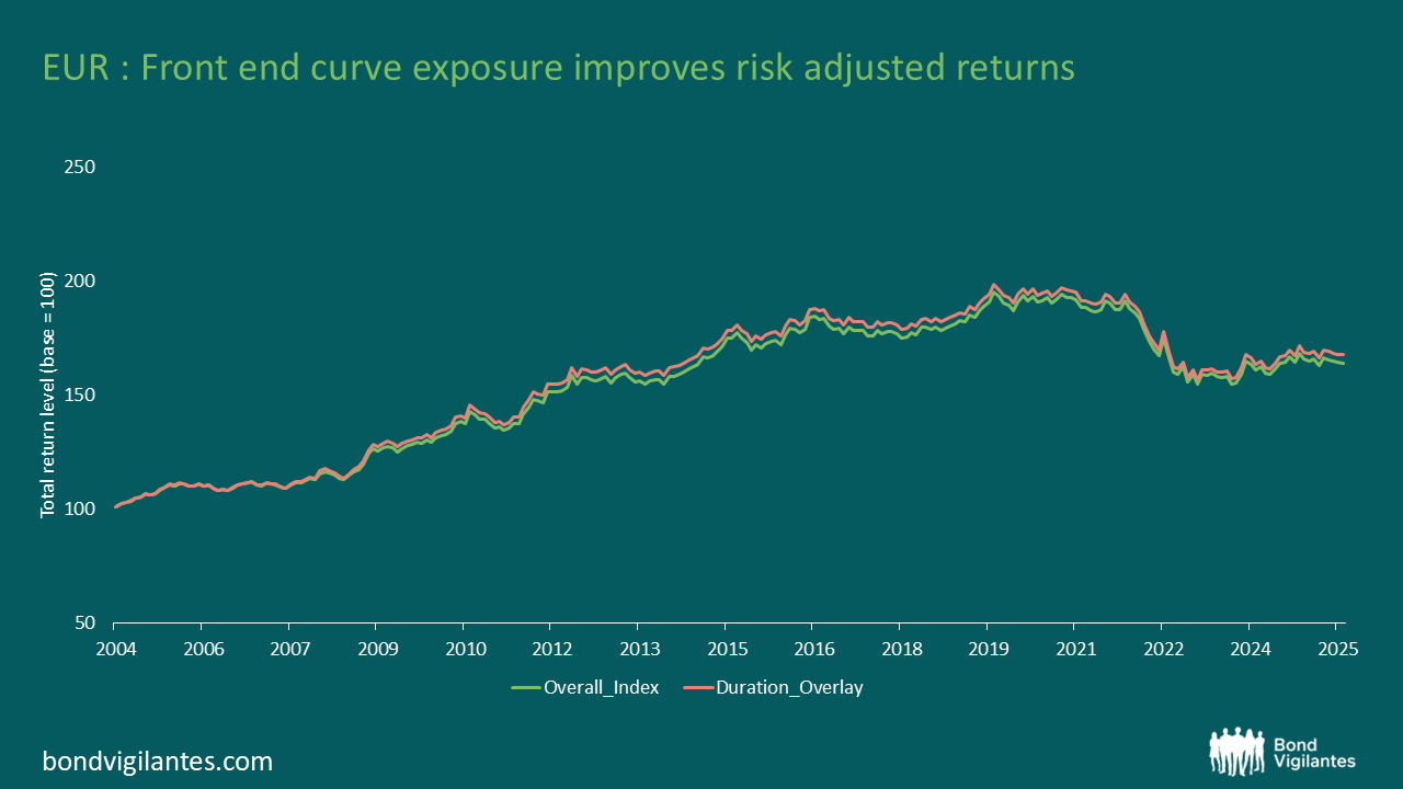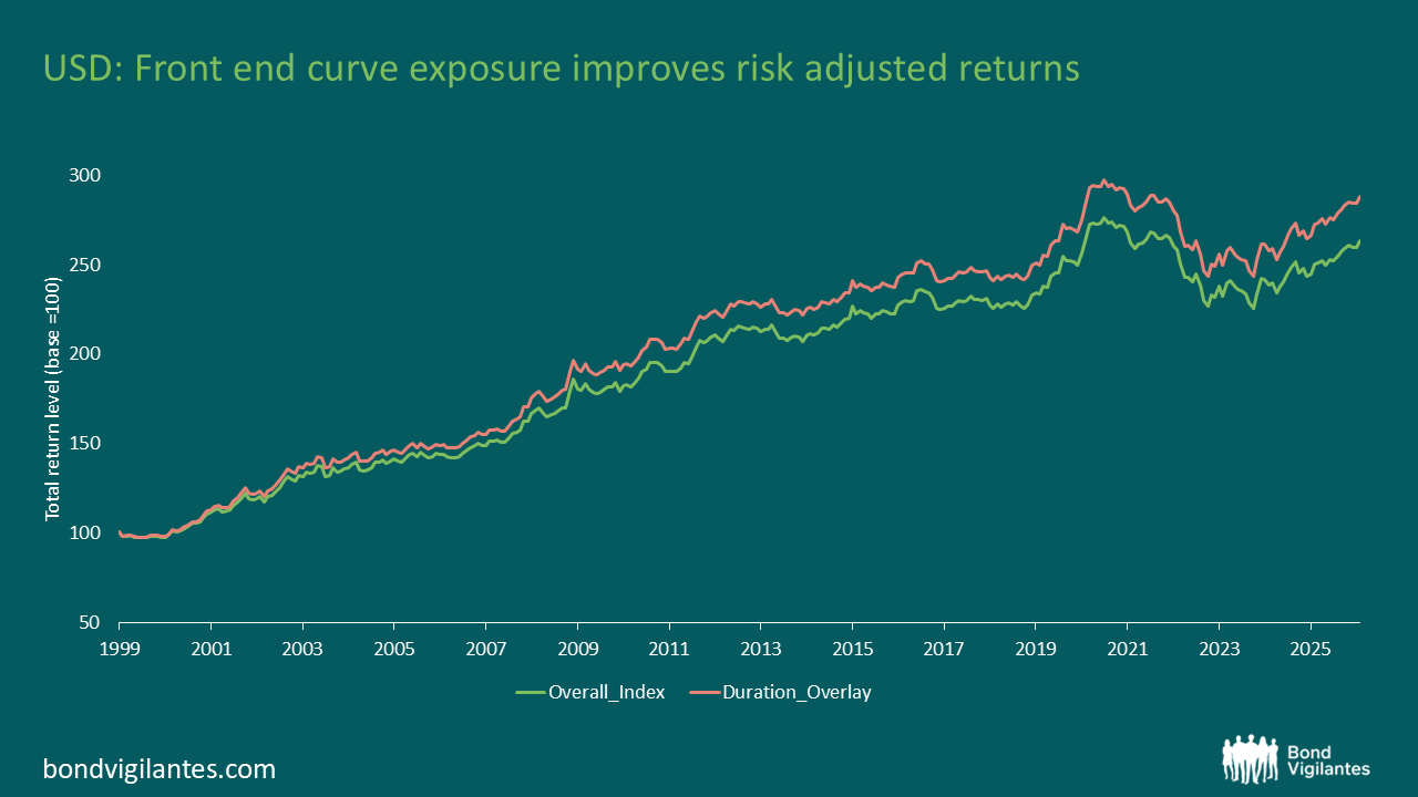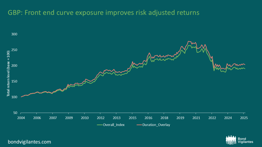 What if we overweight the short-dated bucket and underweight the longer bucket, whilst maintaining a neutral duration across the portfolio? Well, that more or less matches (if not beats) the performance of the overall index and reduces the volatility meaningfully.