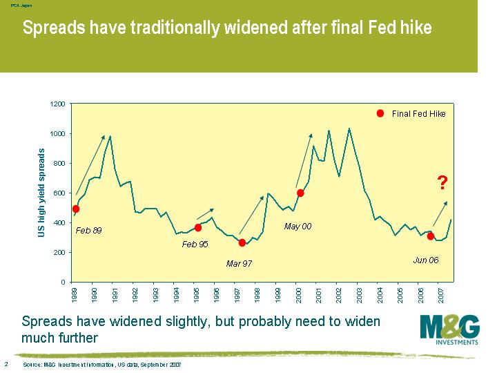 You get a similar story when you mark the high point of the US rate cycle on a graph of high yield spreads, which isn’t a shock seeing as spreads and defaults are closely correlated. As this chart shows, spreads normally start widening just before the final Fed hike in the cycle. This time around though, spreads initially tightened following the final rate hike in June 2006, and the long-awaited sell off only started in June this year. High yield spreads are still very tight on an historical basis, probably because the default rate is still so low. Spreads should widen in tandem with a rising default rate.