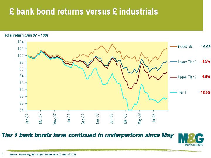 There are a number of reasons for the continued underperformance of bank bonds, and particularly of ‘Tier 1’ bonds. First and foremost is the continuing deterioration in the global financial crisis, and the further stress that this is putting on the banking sector. Professor Rogoff, who was the IMF’s chief economist from 2001-04, last week warned that the worst is still to come, going as far as to say “we’re not just going to see mid-sized banks go under in the next few months, we’re going to see a whopper, we’re going to see a big one – one of the big investment banks or big banks”. These kind of comments aren’t particularly helpful for banks – no bank can withstand a run on its assets and banking is built almost purely on confidence – but Professor Rogoff’s view is becoming increasingly widely shared.