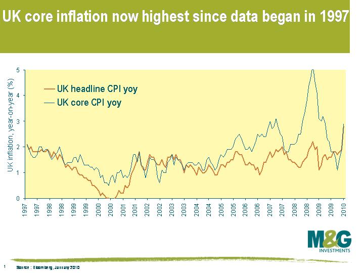Further bad news came in the form of core CPI, which rose from 1.9% to 2.8%,the highest rate since data began in 1997. Core inflation is a less volatile measure since it excludes energy, food, alcohol and tobacco, although it is clearly still affected by base effects, the weakness of sterling and changes in VAT (see a critique that Richard wrote of core vs headline back in 2007 here).