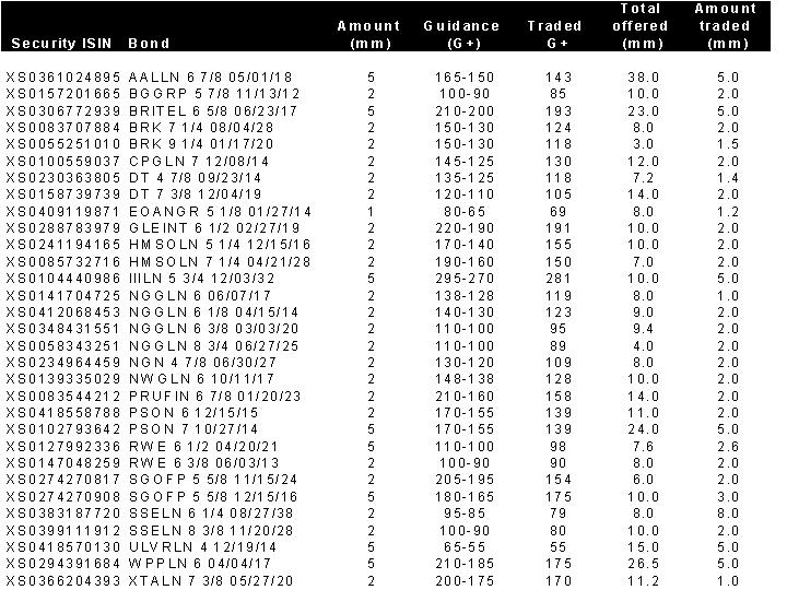 Last week’s BWIC list (bids wanted in competition) from the Bank of England gave further evidence, if it was needed, that the demand for Sterling corporate bonds remains very strong. The table below, kindly provided by HSBC, shows the bonds that were sold and that most traded through where the market was pricing them last Friday.