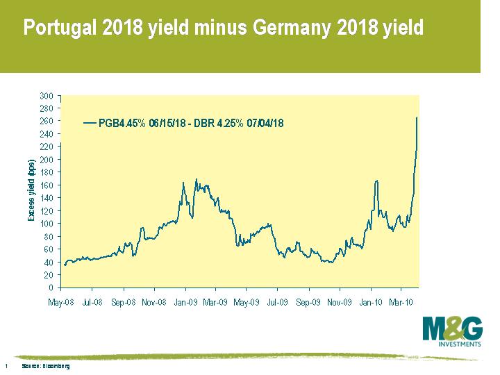 We are now facing something that is likely to prove much more serious. This time the epidemic can be traced to Greece, and contagion is rapidly spreading among the PIGS. At the beginning of April, Portuguese 10 year sovereign debt had an excess yield over German 10 year bunds of about 100 bps. Portugal began showing some worrying symptoms last week, but today things have got a whole lot worse. The attached chart shows the historical yield differential between a German and Portuguese sovereign bond maturing in 2018. The Portuguese bond was issued yielding 40 bps over the benchmark German bund, and today spreads over Germany have lurched to a sickening 260 basis points.