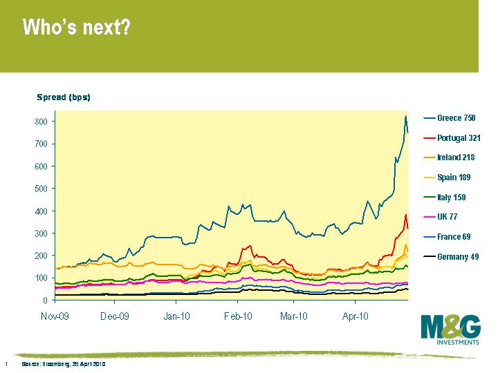Whilst we know that fiscal positions in peripheral Europe are poor, and deteriorating, the worry is that the biggest input into the decisions to downgrade was the movement in bond prices. In other words, credit ratings were cut because the bond prices had fallen. To some extent this is rational – as interest costs rise with higher government bond yields, creditworthiness falls. The rating agencies have explicitly talked about this, for instance when Moody’s cut Greece’s rating earlier this month it said that “there is a significant risk that debt may only stabilize at a higher and more costly level than previously estimated”. In the high yield market the fall in the rating agency default forecast from 20% in 2009 to below 5% has been largely driven by lower junk bond spreads, not an improvement in revenues or profits.