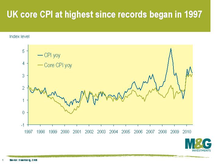The good news was that UK CPI fell from 3.2% to 3.1%. The less good news was that this was 0.1% higher than expectations and remains above the 3.0% upper bound (inflation hasn’t been below 3% since December last year). The worrying news was that the Core CPI measure, which excludes food, alcohol, tobacco and energy prices, jumped 0.2% to 3.1%, and was 0.3% above expectations. Core inflation strips out the more volatile elements of inflation, and if you believe these elements are temporary in nature, then it provides a ‘truer’ picture of inflation. This is the highest core inflation rate since records began in 1997, although it’s a rate that’s been equalled twice already this year. This chart shows CPI versus core CPI since 1997.