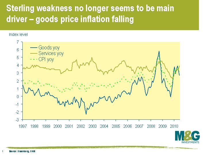 The reason for inflation coming in higher than expected was down to the services component (see chart), which is also a bit worrying. Goods price inflation (currently 55% of the CPI bucket) had been the main driver of the UK inflation rate, with part of the reason likely to have been the lagged effect of sterling weakness (see previous blog here). However, an increase in the services component (45% of CPI) suggests that inflationary pressure is beginning to come from domestic sources rather than international sources.