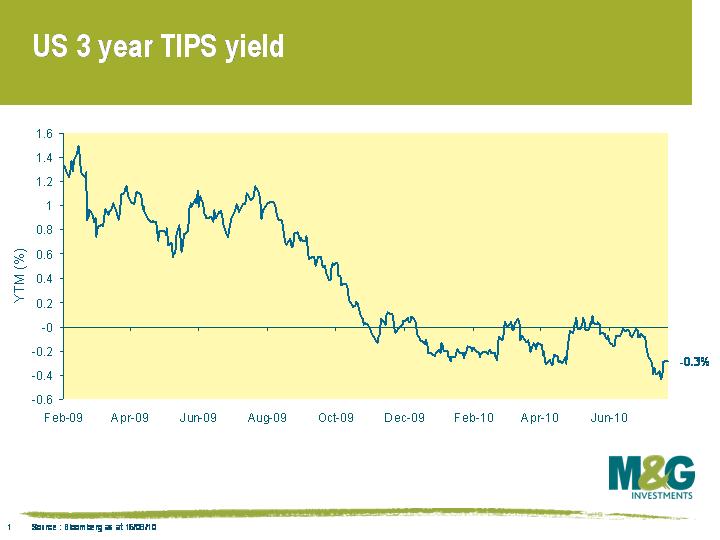 2) Government bond yields traditionally reflect an amount related to nominal GDP growth in an economy. You have a choice – lend $100 to the government or invest it across the whole US economy and receive the average growth rate across all sectors, plus compensation for inflation. The efficient markets hypothesis says that ex-ante there shouldn’t be a difference between the two, or capital will flow from one to the other to equalise the difference. If you buy an inflation linked bond, you can remove the inflation compensation element of this calculation, so the TIPS real yield equals expected US GDP growth over future years. The market therefore believes that we are heading into a period of prolonged negative economic growth.