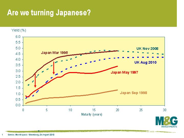 Is the market justified in believing that we’re turning Japanese? Some may argue that the economic recovery in the developed world from early 2009 has looked distinctly un-Japanese. Preliminary figures for real UK GDP in Q2 were +1.1% (unannualised), the fastest pace of expansion since Q1 2001. US GDP hit an annualised rate of +5.0% in Q4 2009 and +3.7% in Q1 2010. While the recent estimate for US GDP in Q2 was a weaker +2.4%, global economic data (even in the US) is not (yet) suggesting anything worse than a modest slowdown.