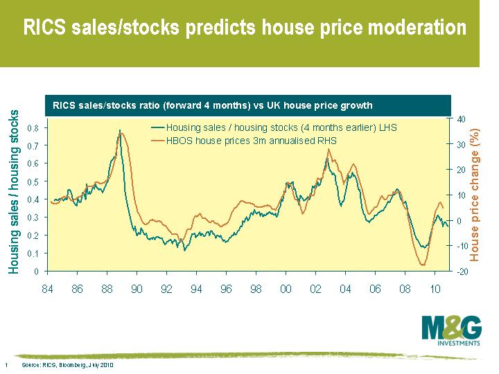 We’ve focused on the UK and US housing markets on this blog a lot over the years, and forward looking indicators such as sales/stocks ratios or mortgage approvals played a primary role in shaping our exceptionally gloomy view on the UK and US housing markets (and hence financial markets) in 2008. The correlations between the variables has changed, as correlations always do, but you can definitely get a feel for which way the UK housing market is headed by eyeballing this updated chart, which plots UK house prices against the RICS sales/stocks ratio (ie the number of sales that estate agents have made over a rolling 3 months divided by the total number of properties that estate agents have on their books). A low ratio implies a glut of supply and/or poor demand, while a high number suggests houses are flying off estate agents’ books.