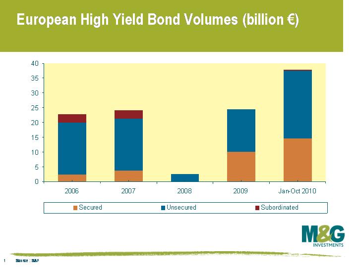 Issuance in the high yield bond market in Europe this year through October has already exceeded the total issuance for the full year in 2009. The novelty since the reopening of the market in 2009 has been the fact that high yield corporates have been looking to refinance senior secured bank loans into senior secured bonds, rather than the more common unsecured bonds. As such, the proportion of secured bonds issued by high yield companies after the financial crisis has been ~40% of total issuance compared with the more muted 10-15% level before the crisis (see chart).