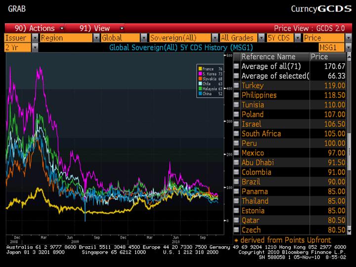 This chart shows French CDS versus a number of single A rated issuers. As you can hopefully just about see, France (AAA) is now wider than single A issuers such as China, Malaysia, Chile, Slovakia and even South Korea (whose 5y CDS reached almost 500 in early 2009). If the perceived risk of French default increases further in the next few months, which is quite possible given the French public’s lack of appetite to engage in any meaningful reform, it won’t be long until France trades wider than another group of emerging markets including BB rated Colombia. France obviously isn’t alone in terms of developed economies seeing their risk of default rising; the big story this week has been Ireland (rated AA-), which yesterday briefly saw its sovereign CDS trade wider than Argentina (rated B-).