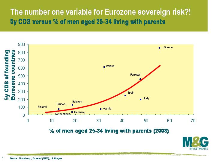 Or, on a more light-hearted note, perhaps austerity, growth and inflation have little to do with default risk. JP Morgan have an alternative explanation (see chart).