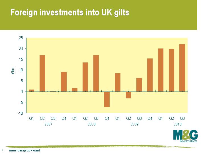 Perhaps this is overly pessimistic. Although this data is for Q3, and therefore doesn’t reflect the most recent wobble in confidence, it shows that foreign investors bought £22.115 billion of UK gilts in that quarter – and £77 billion over a 12 month period, a massive help for the UK’s financing requirements. This shows that overseas investors are confident that the UK will remain a AAA rated bond market (with the debt burden tackled by the Tory/LibDem austerity programme), and also reflects a safe haven status at a time when peripheral European bond markets have been collapsing. So no need for panic in the UK gilt market yet – but if yesterday’s numbers reflected the start of a string of poor budget deficit numbers, and inflation remains higher than most gilt yields (you don’t earn CPI until you lend out to 8 years on the yield curve, and you don’t earn RPI anywhere outside of inflation-linked gilts) then there will be cause to worry.