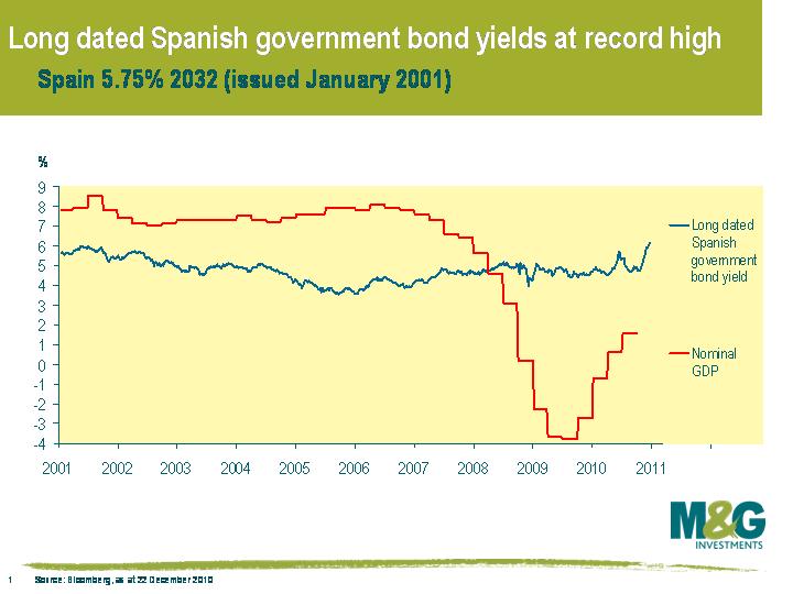 The convention in the market is to estimate a country’s degree of distress by looking at the yield spread over a ‘risk free’ rate. So in the case of eurozone countries, people tend to look at the spread over German government bonds.